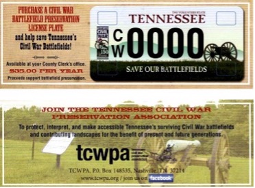 With more than 1660 “Save Our Battlefields” license plate on the road, your gift is more important than ever. In fact, the revenue raised through license plate sales accounts for 30% of TCWPA’s annual operating budget. Even more important are your preservation gifts and membership renewals which provide 25% of TCWPA’s annual operating budget. This means your gifts, donations, license plate sales, membership renewals allow TCWPA to continue to hold educational, preservation and Three Star tours, annual meetings, award over $125,464 in preservation/interpretation grants since 2005, and help TCWPA sustain its work to preserve and interpret Civil War battlefields. You are a critical part of this process, and we could not accomplish our many goals without YOU and the support you provide. With your generous gifts – we will continue to connect people and places through preservation so our children, grandchildren and great -grandchildren can enjoy Tennessee’s Civil War battlefields.