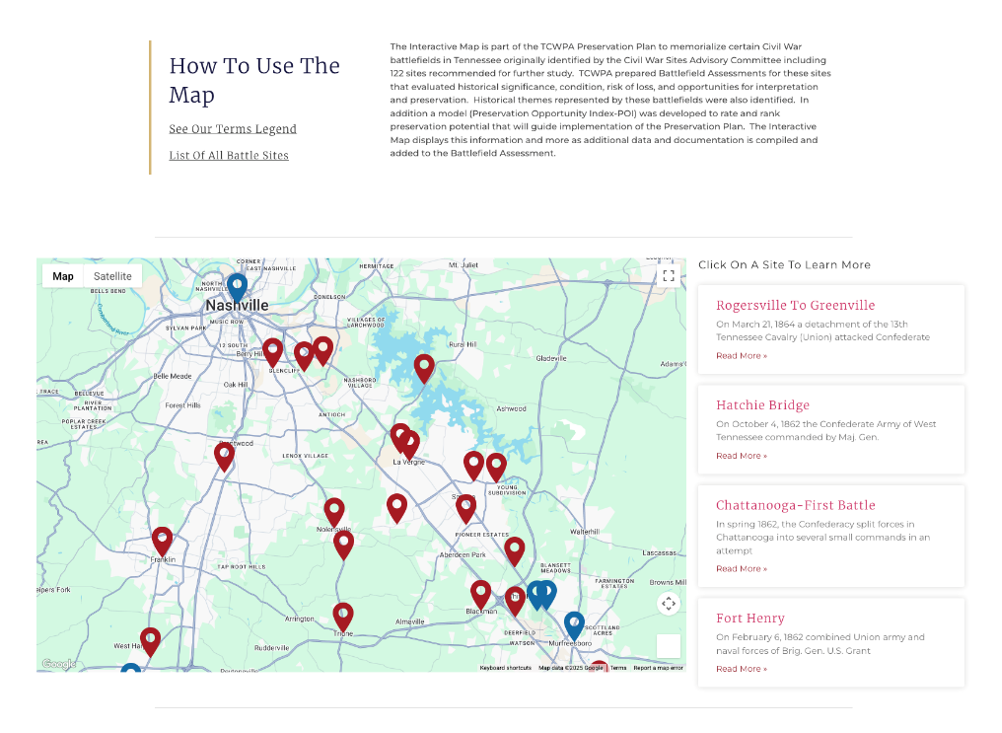A significant component of the Preservation Plan has been the development and utilization of the online Interpretive Map. The map is the most viewed page on the website where visitors spend considerable time examining its content. This website feature promises to be an important platform for sharing information about battlefields, promoting interest, and identifying opportunities for interpretation and preservation. The interactive map can be viewed at www.tcwpa.org/interactive-map.