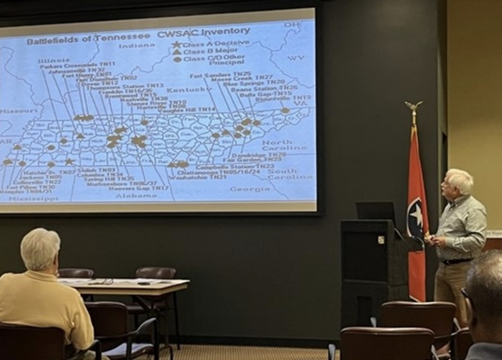 The TCWPA leadership team continued its mission to protect and preserve Tennessee Civil War Battlefields with emphasis on its educational and preservation grants program. Since 2005, your generous annual gifts and proceeds from the “Save Our Battlefields” specialty license plate have supported more than seventy-eight battlefield preservation grants! In 2024, your generous annual gifts and proceeds from the “Save Our Battlefields” license plate supported seven battlefield preservation grants including preservation and interpretation grants given in partnership with American Battlefield Trust for Shy’s Hill, Missionary Ridge, and Shiloh National Military Park. In addition, preservation and interpretation grants were given to Spring Hill Cemetery, Thompson’s Station, Knoxville Civil War Roundtable and Johnsonville State Historic Park. In 2024, two leaders from Franklin were awarded the Peckham / Ragland Award which goes to a community member(s) who have made outstanding contributions to the preservation and interpretation of Tennessee’s Civil War battlefields. This year two leaders from Franklin were selected, Mike Hoover and Bob Ireland, and both reflect an outstanding