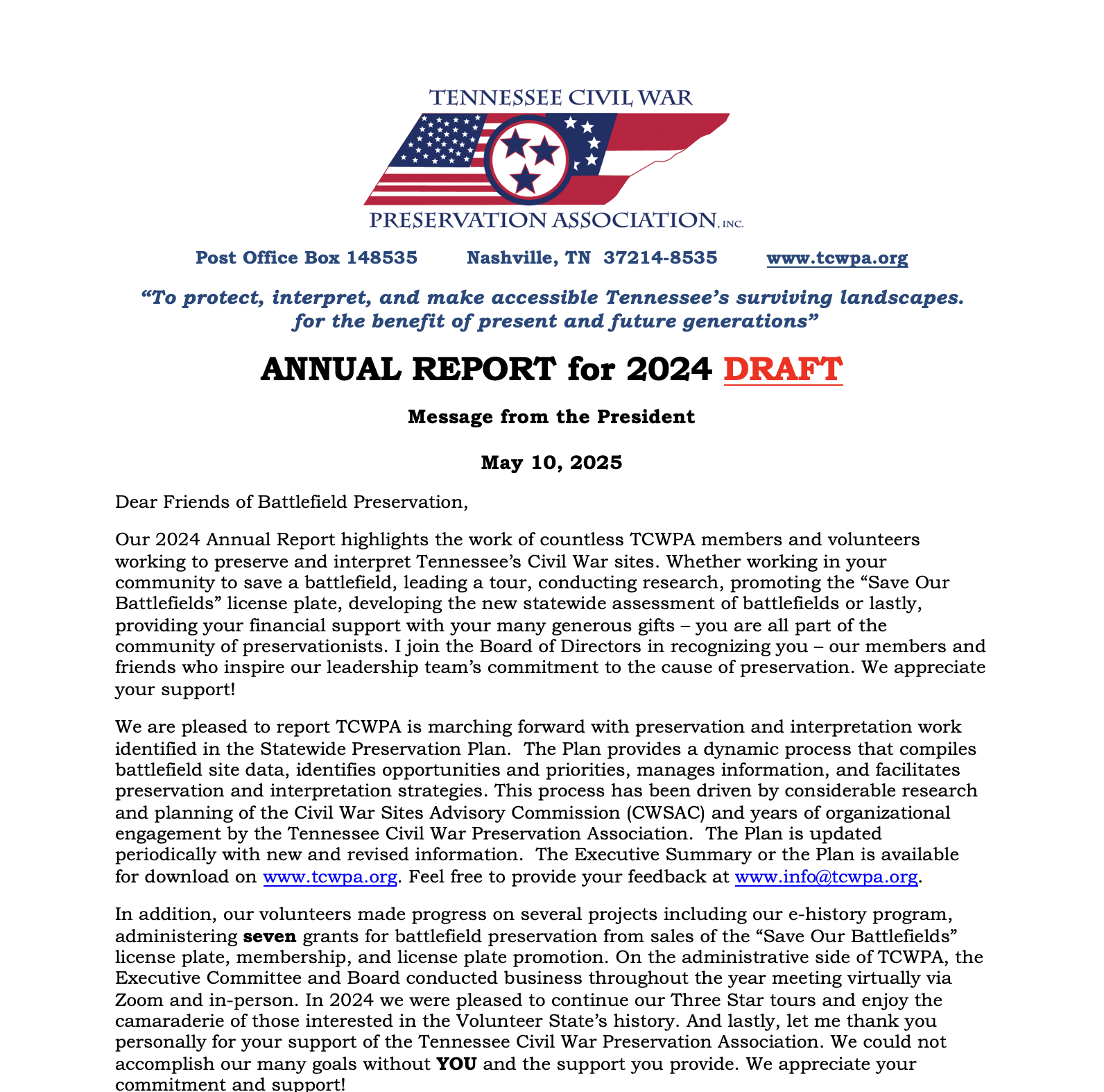 In addition, our volunteers made progress on several projects including our e-history program, administering seven grants for battlefield preservation from sales of the “Save Our Battlefields” license plate, membership, and license plate promotion. On the administrative side of TCWPA, the Executive Committee and Board conducted business throughout the year meeting virtually via Zoom and in person. In 2024 we were pleased to continue our Three Star tours and enjoy the camaraderie of those interested in the Volunteer State’s history. And lastly, let me thank you personally for your support of the Tennessee Civil War Preservation Association. We could not accomplish our many goals without YOU and the support you provide. We appreciate your commitment and support! We always welcome your comments and suggestions. Please feel free to contact us in writing or by email at info@tcwpa.org.